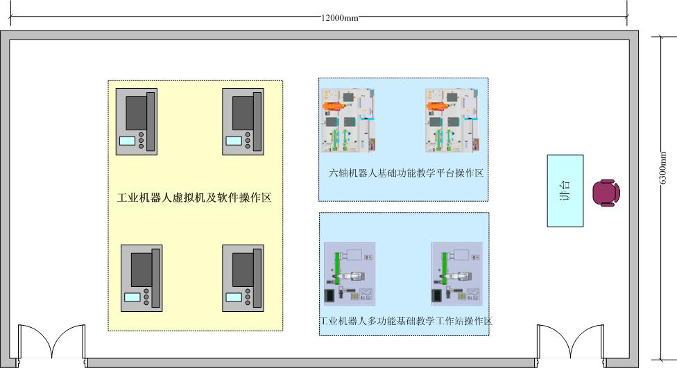 本专业实验室包含2套六轴机器人基础功能教学平台、2套工业机器人多功能基础教学工作站、4套工业机器人虚拟机和相关的机器人教学仿真软件。本实验室设备系统针对院方所提出的各种指标所设计,机器人、1套皮带输送线、码垛摆放架、若干工件工装、单元控制器及电气系统等设备组成,可实现码垛、TCP标定、绘图等模拟演示,同时能展开与机电一体化相关的一系列实验实训内容。